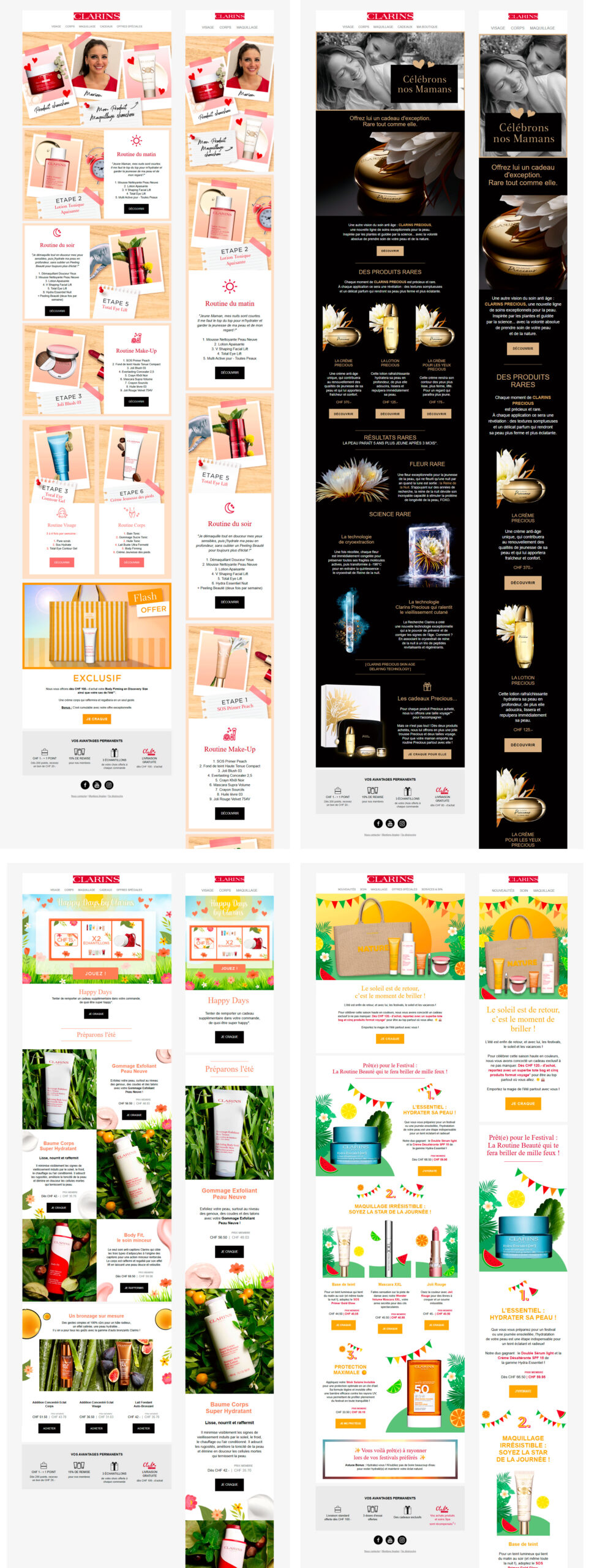 Création graphique de divers Newsletters responsives pour CLARINS Suisse et intégration dans l’outil d’emailing Badsender en versions desktop & mobile